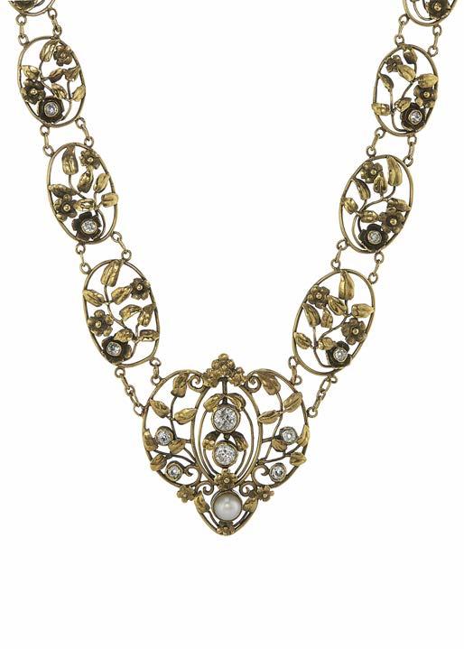 62 Edward Everett Oakes (attributed), an impressive American Arts & Crafts gold, old-cut diamond and split pearl floral openwork necklace, with later gold filled spring ring clasp, estimated total diamond weight 2ct, I-J colour, predominantly SI clarity, length 45.5cm, 43.9g