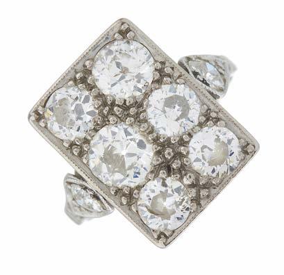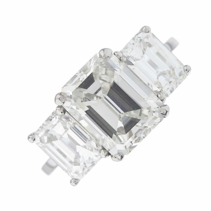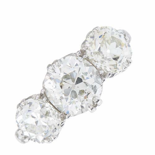 31. An early 20th century platinum old-cut diamond threestone ring, with stylised fleur-de-lys shoulders, estimated total diamond weight 3.50ct, I-J colour, VS2-SI clarity, later hallmarks for London, ring size K1/2, 3.7g