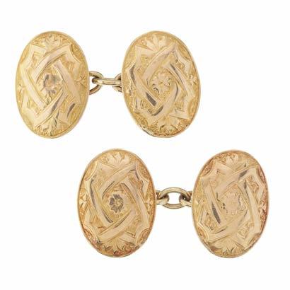 8 A pair of late Victorian 15ct gold cufflinks, each designed as an oval-shape floral engraved panel, with connecting chain, hallmarks for Birmingham 1877, length of cufflink face 1.7cm, 4.6g £100 - £150
