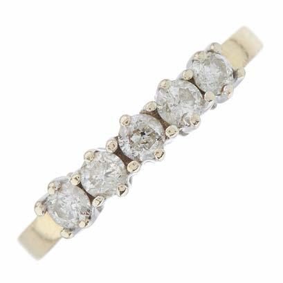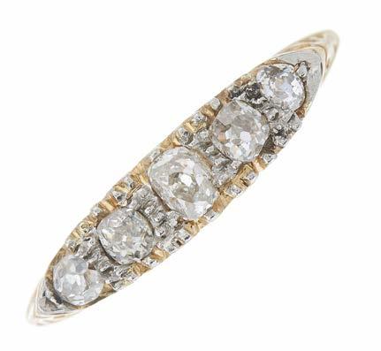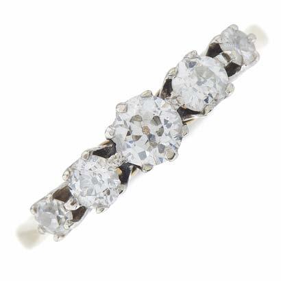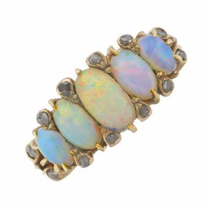 7 A late Victorian 18ct gold graduated oval opal cabochon five-stone dress ring, with rose-cut diamond double spacers and shoulders, principal opal measures approximately 8 by 4.5 by 2.7mm, ring size Q, 5.3g £300 - £400