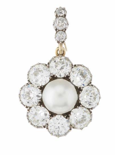 34 An impressive late Victorian silver and gold, natural pearl and old-cut diamond cluster pendant, with similarly-cut diamond line surmount, with report from The Gem & Pearl Laboratory, stating natural saltwater pearl, weighing 4.40ct, measuring approximately 9 by 9.1 by 7.1mm, estimated total diamond weight 6.50ct, predominantly H-I colour, VS2-SI clarity, length 3.5cm, 5.9g, with fitted case £8,000 - £12,000
