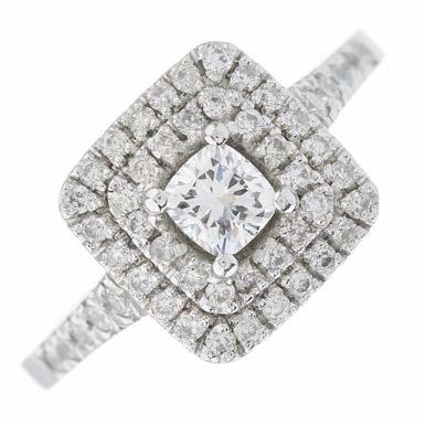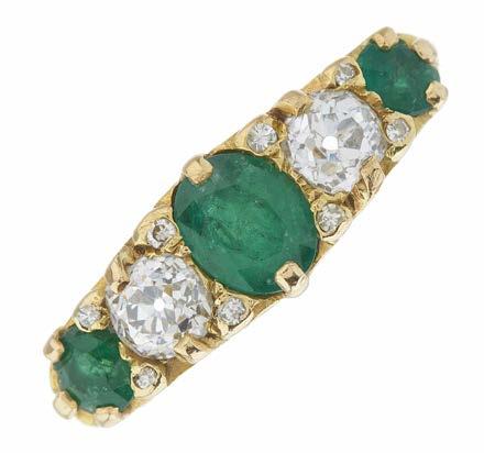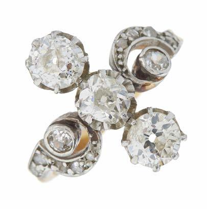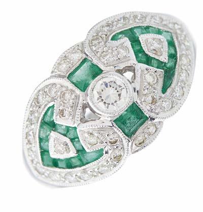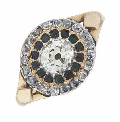 39. A late Georgian gold, old-cut diamond and green gem cluster ring, with old-cut diamond surround and tapered shoulders, estimated total diamond weight 1ct, principal diamond estimated weight 0.70ct, J-K colour, VS2-SI1 clarity, ring size M, 3.6g £1,000 - £1,500