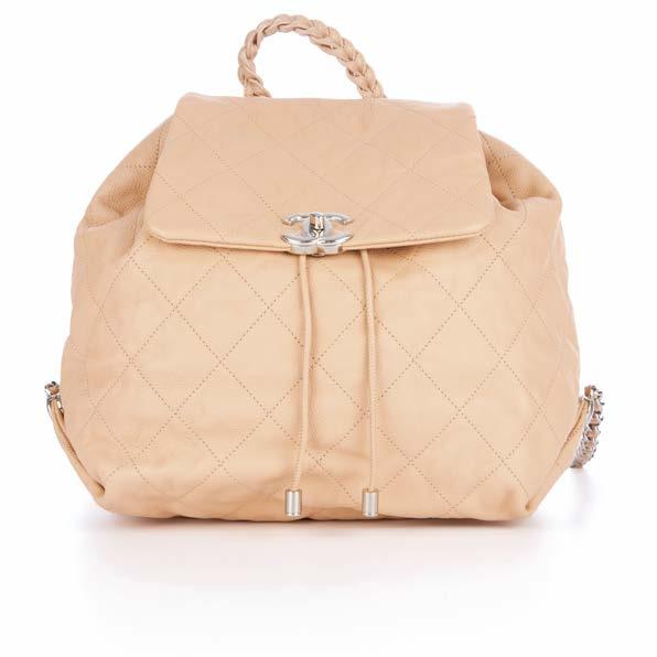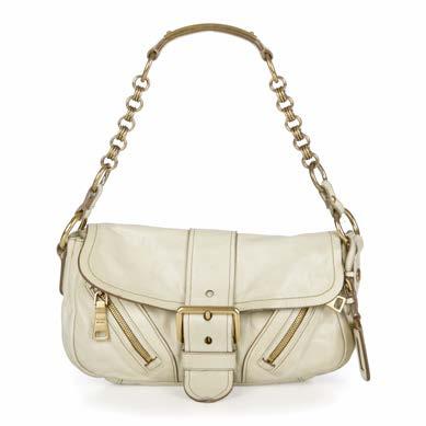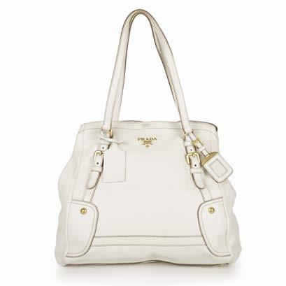 352. Prada, a Talco Vitello Shine handbag, crafted from cream leather, with brushed gold-tone hardware, chain-link strap with reinforced shoulder guard, three exterior zip pockets, magnetic flap closure with front buckle detail, interior snap button fastening and a pale pink lined interior, measuring 9 by 17 by 28cm, with maker’s authenticity card and care guide £120 - £180