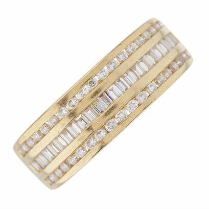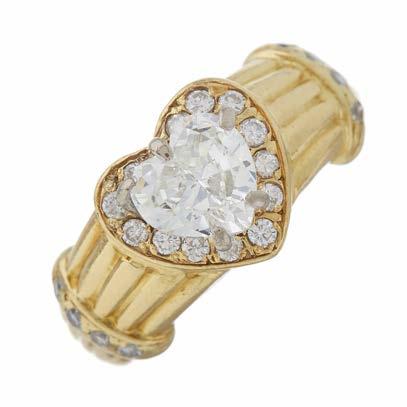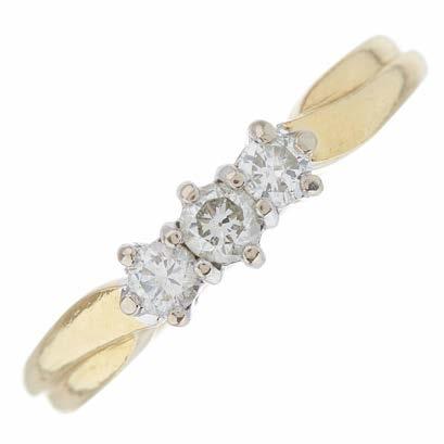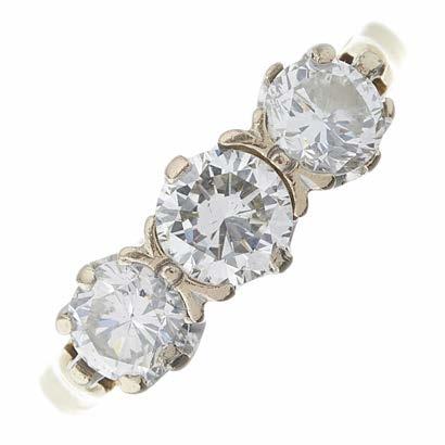 27 An Art Nouveau 18ct gold diamond three-stone dress ring, circa 1905, with vari-cut diamond scrolling sides and grooved band, estimated total diamond weight 2ct, I-K colour, SI2-P1 clarity, French assay marks, ring size N, 5.4g £800 - £1,200