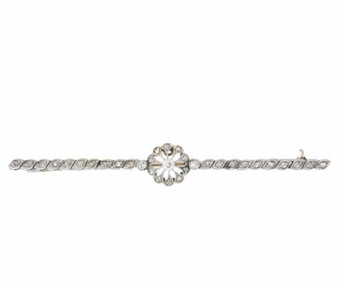 22 An Edwardian old and rose-cut diamond openwork bar brooch, with rose-cut diamond line sides, estimated total diamond weight 0.40ct, principal old-cut diamond estimated H-I colour, VS clarity, length 7.1cm, 4.8g £120 - £180