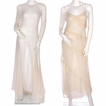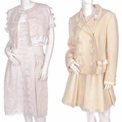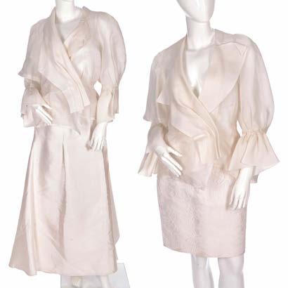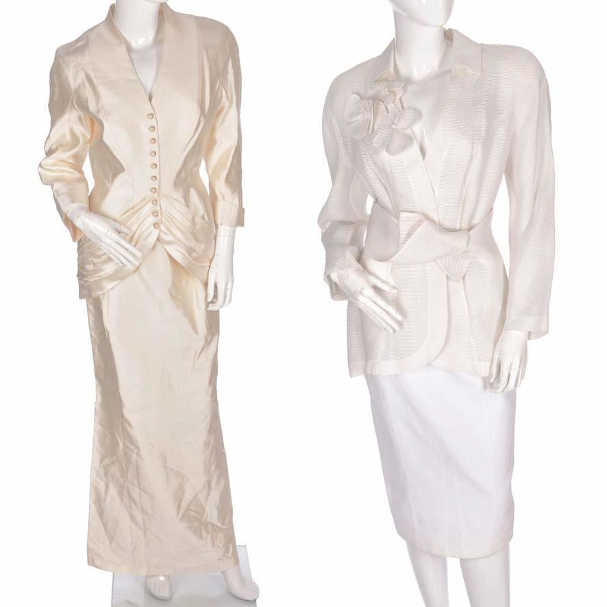 361. Thierry Mugler, two ladies outfits, to include an ivory silk outfit, comprising a fitted jacket with faux pearl embellished button fastenings and ruched detailing and a full-length matching skirt, together with a cotton and silk blend jacket and a white cotton pencil skirt, labelled Thierry Mugler, sizes 38 and 40 (UK 10 and 12) £150 - £200
