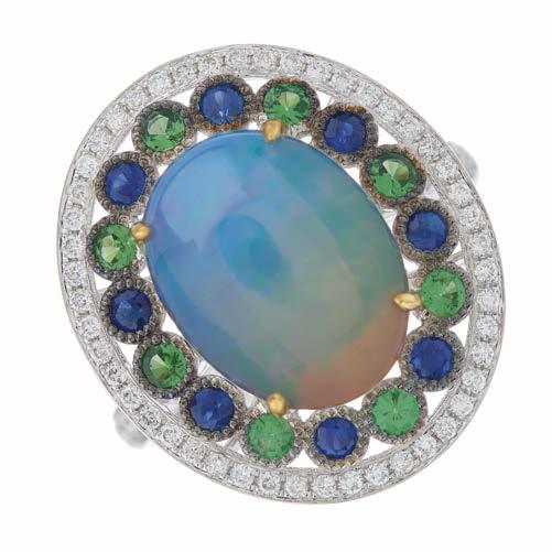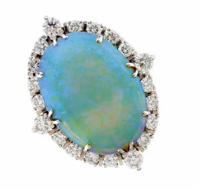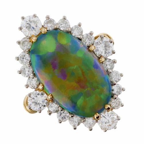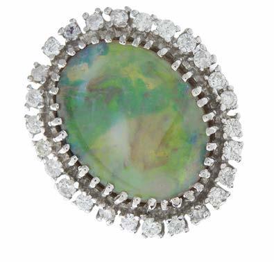 10 An Edwardian white metal, opal cabochon and old-cut diamond floral cluster ring, with engraved band, estimated total diamond weight 1.10ct, predominantly H-I colour, VS2-SI clarity, ring size N, 6.8g £600 - £800