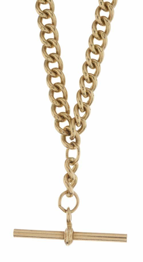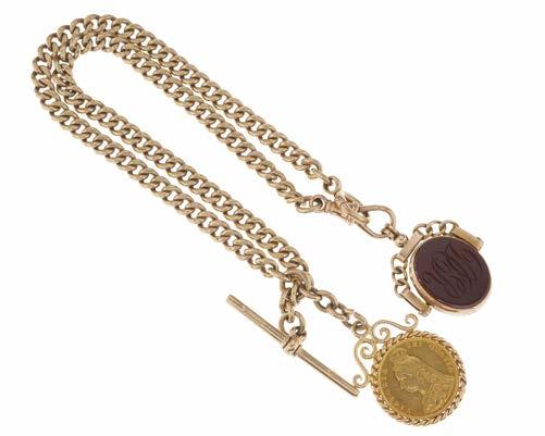 40. A late Victorian 9ct gold Albert two-row chain, with lobster clasp and T-bar, suspending a 9ct gold hardstone swivel fob and Victoria half sovereign coin dated 1887, fob with hallmarks for Chester 1898, length of chain 19.5cm, length of fobs 3.5 and 2.8cm, total weight 46g £600 - £800