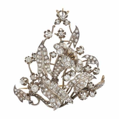 30 A mid to late 19th century Continental silver and gold, old-cut diamond floral pendant, designed as a foliate spray with a lily flower, estimated total diamond weight 6 to 7ct, principal diamond estimated H-I colour, VS clarity, length 6.8cm, may also be worn as a brooch, 33g £2,000 - £3,000