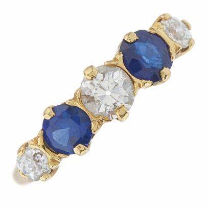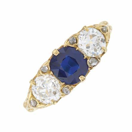 1 A late Victorian 18ct gold cushion-shape sapphire and old-cut diamond three-stone ring, with rose-cut diamond spacers and scrolling gallery, sapphire estimated weight 1ct, estimated total diamond weight 1ct, I-J colour, VS clarity, band stamped 18ct, ring size P, 4.4g £400 - £600