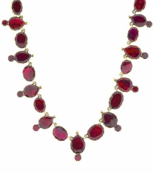 35 A late Georgian gold, foil back garnet riviere necklace, with concealed push-piece clasp, length 43cm, 28.6g