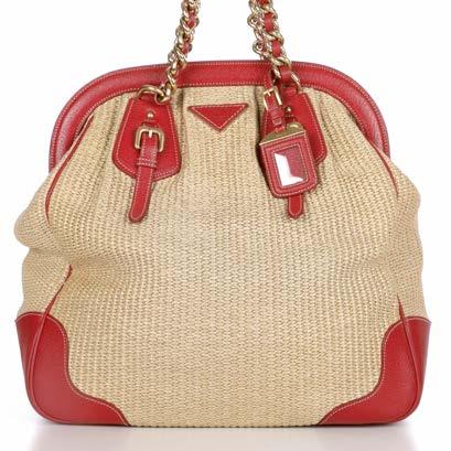 353 Prada, a Raffia Chain tote, designed with a beige woven raffia exterior, with red leather trim, brushed gold-tone hardware, interlaced chain with red leather handles, magnetic snap button fastenings and jacquard logo pattered lining, measuring 15 by 35 by 37cm £400 - £600