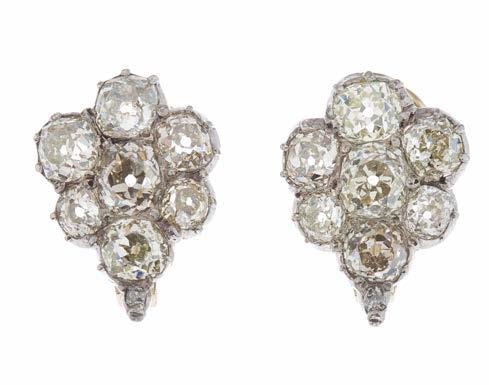41. A pair of mid to late 19th century silver, old-cut diamond cluster earrings, each with later gold posts and hinged clip fittings, estimated total diamond weight 4.20ct, tinted colour, VS2-SI2 clarity, principal two diamonds estimated total weight 1ct, length 1.7cm, 5.8g £2,000 - £3,000