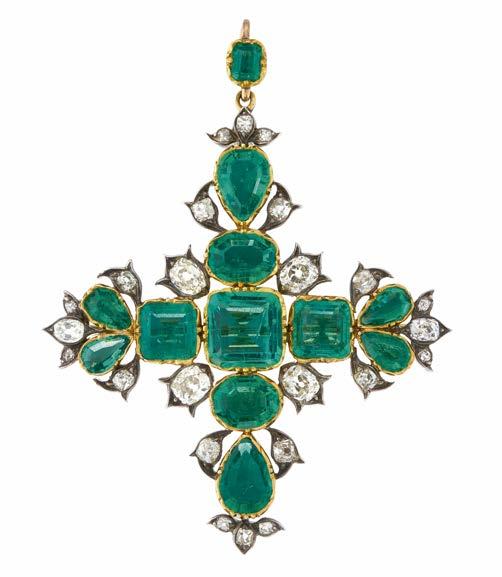 33. An exceptional mid to late Victorian silver and gold, Colombian emerald and old-cut diamond cross pendant, principal emerald estimated weight 2.30ct, with report from GCS, stating Colombia, insignificant to minor indications of clarity enhancement, estimated total diamond weight 2.25ct, I-K colour, VS2-SI clarity, length 6.5cm, 14.5g £4,000 - £6,000
