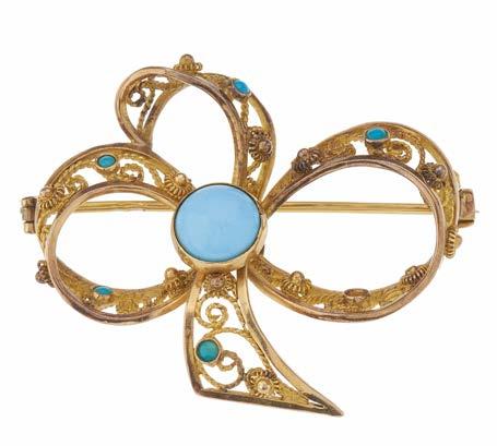 20 A 19th century gold, turquoise cabochon openwork bow brooch, with rope-twist detail, foreign marks, stamped 800, length 4.1cm, 11.2g £200 - £300