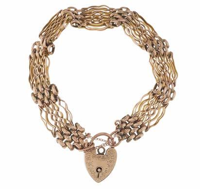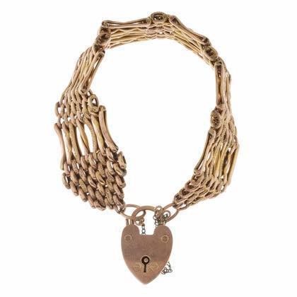 2 An early 20th century 9ct gold gate bracelet, with heartshape padlock clasp and safety chain, stamped 9c, length 19cm, total weight 25g £300 - £400
