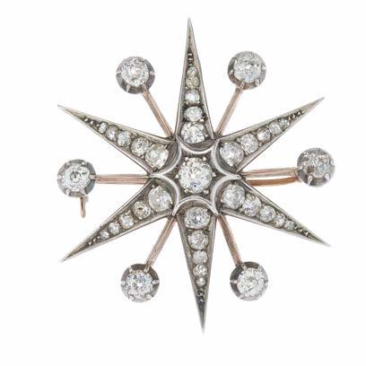 36 A late Victorian silver and gold, old-cut diamond star brooch, estimated total diamond weight 3ct, principal diamond estimated H-I colour, VS2-SI1 clarity, diameter 4.1cm, 10g £1,500 - £2,000