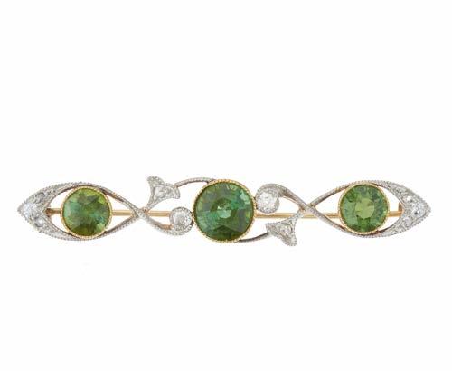 18 An Edwardian gold and silver, green tourmaline and vari-cut diamond foliate openwork bar brooch, estimated total tourmaline weight 2ct, estimated total diamond weight 0.30ct, length 4.6cm, 4.6g £200 - £300