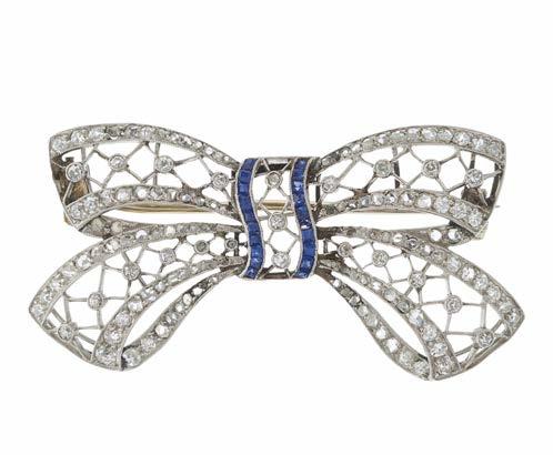 24 An Edwardian vari-cut diamond and calibre-cut sapphire openwork bow brooch, estimated total diamond weight 1.25ct, length 4.5cm, 8.2g £800 - £1,200