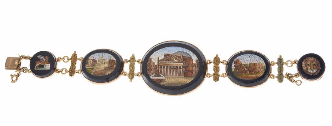 38 A late 19th century gold micro mosaic bracelet, designed as a series of graduated panels depicting ancient ruins and lions, with scrolling engraved spacers and push-piece clasp, length 19cm, 45.2g £400 - £600