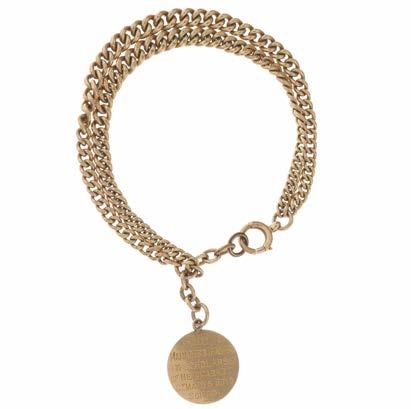 29 An early 20th century 9ct gold graduated curb-link tworow bracelet, suspending a circular charm, with personal engraving dated Sep 28th 1914, length 20cm, 24g £200 - £300