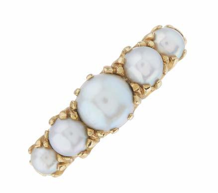 11 A late Victorian 18ct gold graduated split pearl fivestone ring, with tapered shoulders, ring size Q1/2, 3.8g