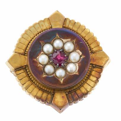 43 A late Victorian gold, purple garnet and split pearl cluster brooch, with vacant glazed reverse and safety chain, diameter 3.6cm, total weight 10.7g £100 - £150