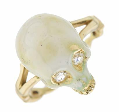 42. An 18ct gold white enamel skull ring, with rose-cut diamond eyes and openwork band, hallmarks for London, ring size N, 7.8g £1,000 - £1,500