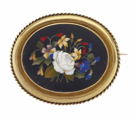 6 A late Victorian gold, oval-shape pietra dura brooch, designed to depict a floral spray, within a rope-twist surround, length 6.5cm, 25.1g £200 - £300