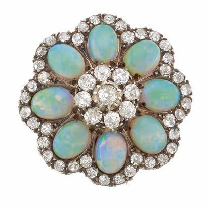 4 A late Victorian silver and gold, opal cabochon and oldcut diamond floral cluster brooch, estimated total diamond weight 1.85ct, predominantly H-I colour, SI clarity, diameter 2.6cm, 6.8g £600 - £800