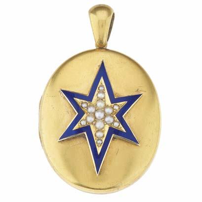 26 A late Victorian gold locket pendant, with central blue enamel and split pearl star overlay, opening to reveal two compartments, one glazed, length 5.7cm, total weight 22g £600 - £800