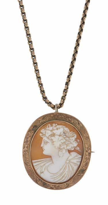 13. An early 20th century 9ct gold shell cameo pendant, carved to depict a Bacchante, suspended from a 9ct gold fancy-link chain, pendant may also be worn as a brooch, stamps to indicate 9ct gold, length of pendant 5.3cm, length of chain 49cm, 24.3g
