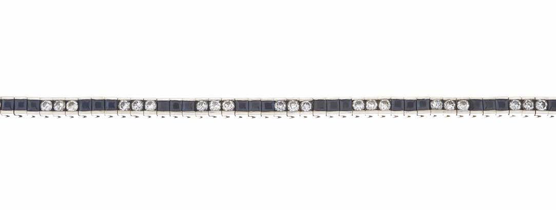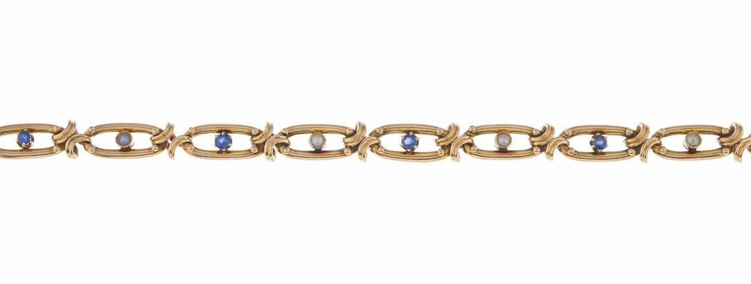 28 An early 20th century 15ct gold alternating sapphire and split pearl openwork bracelet, with partially concealed push-piece clasp, stamped 15ct,
