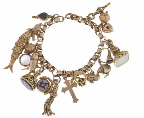 15. An early to mid 20th century gold charm bracelet, suspending nineteen various charms, with spring ring clasp, length 19cm, total weight 48.4g £400 - £600