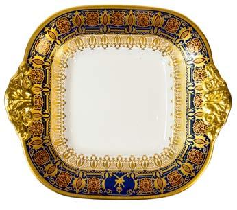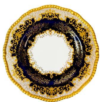 45 Royal Crown Derby 19th century rimmed bowl, hand-painted with pink roses between alternating panels of dark blue and heavy gilt overlay, together with a Coalport porcelain 19th century soup plate, featuring birds and floral patterns embellished with extensive gilt decoration. (D: 25cm) (2)