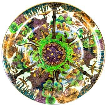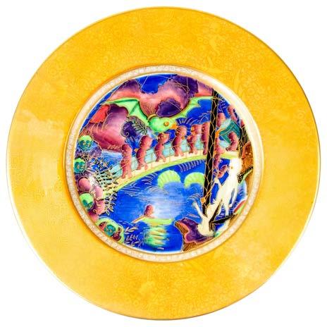 14 Lorna Bailey for Old Ellgreave Pottery Vibrant charger, Kaleidoscope design in bright orange, red, black on yellow ground, Limited edition 60/100, signed Lorna Baily. 36cm dia.