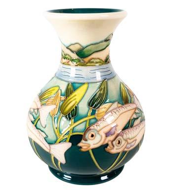 18 Lorna Baily ‘Mirage’ vase for Old Ellgreave Pottery together with a cylindrical vase depicting fish in a relief pattern, limited edition 12/50, both signed. Tallest:20cm (2)
