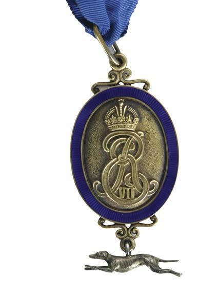 A rare first pattern Edward VII King’s Messenger’s Badge, silver, silvergilt and enamel, the oval badge bordered by a plain blue enamel band, EVIIR cypher to the centre in relief against a seeded ground, pendant silver greyhound to a scrolling bracket below, fitted for wear at the neck with an oval suspension loop to a corresponding bracket above, with a length of narrow blue silk neck cravat, reverse numbered ‘4’, height excluding greyhound 65 mm, about extremely fine.