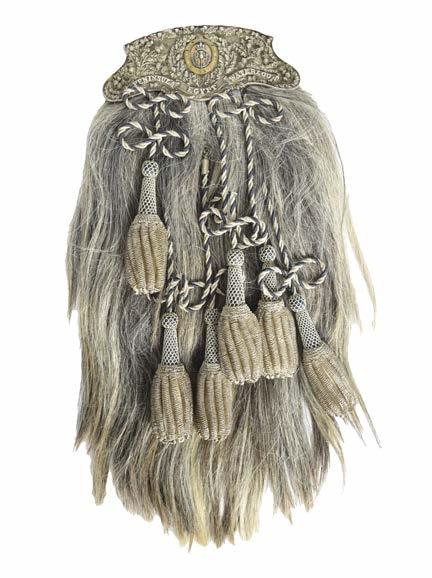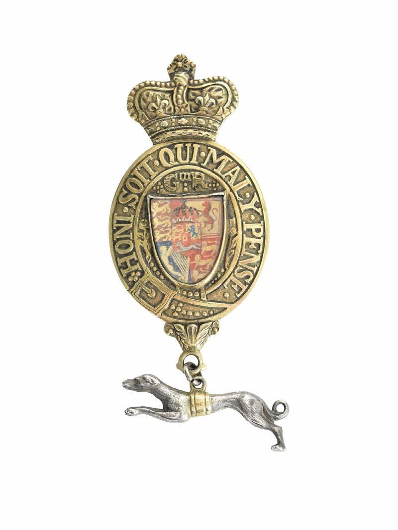 A George III King’s Messenger’s Badge, silver and silver gilt, the oval badge encircled by a garter with legend in sunken relief, the centre with painted Hanoverian arms to a glazed shieldshaped compartment, the whole surmounted by a crown and with a pendant silver greyhound to an acanthus leaf bracket beneath, fitted for wear with a fixed ring to the reverse of the crown, height excluding greyhound 112 mm, good very fine.