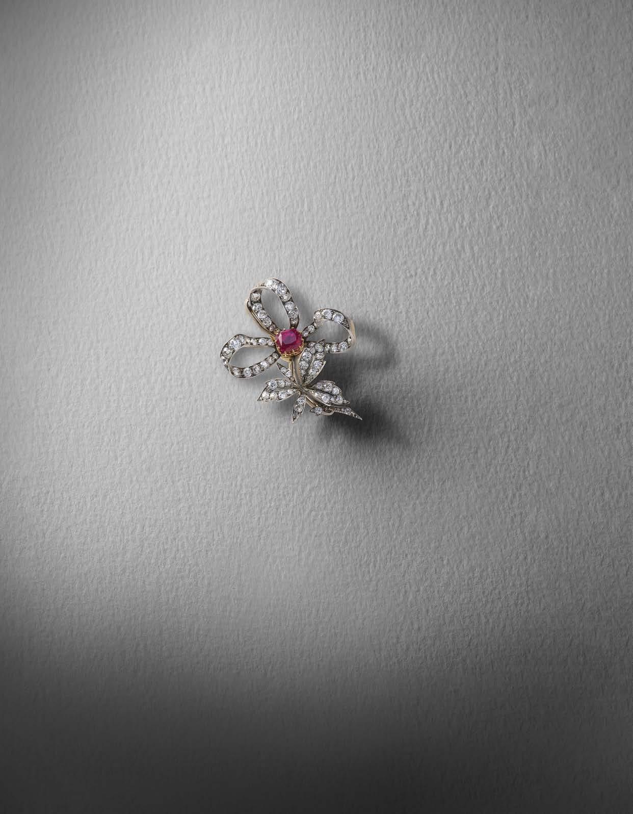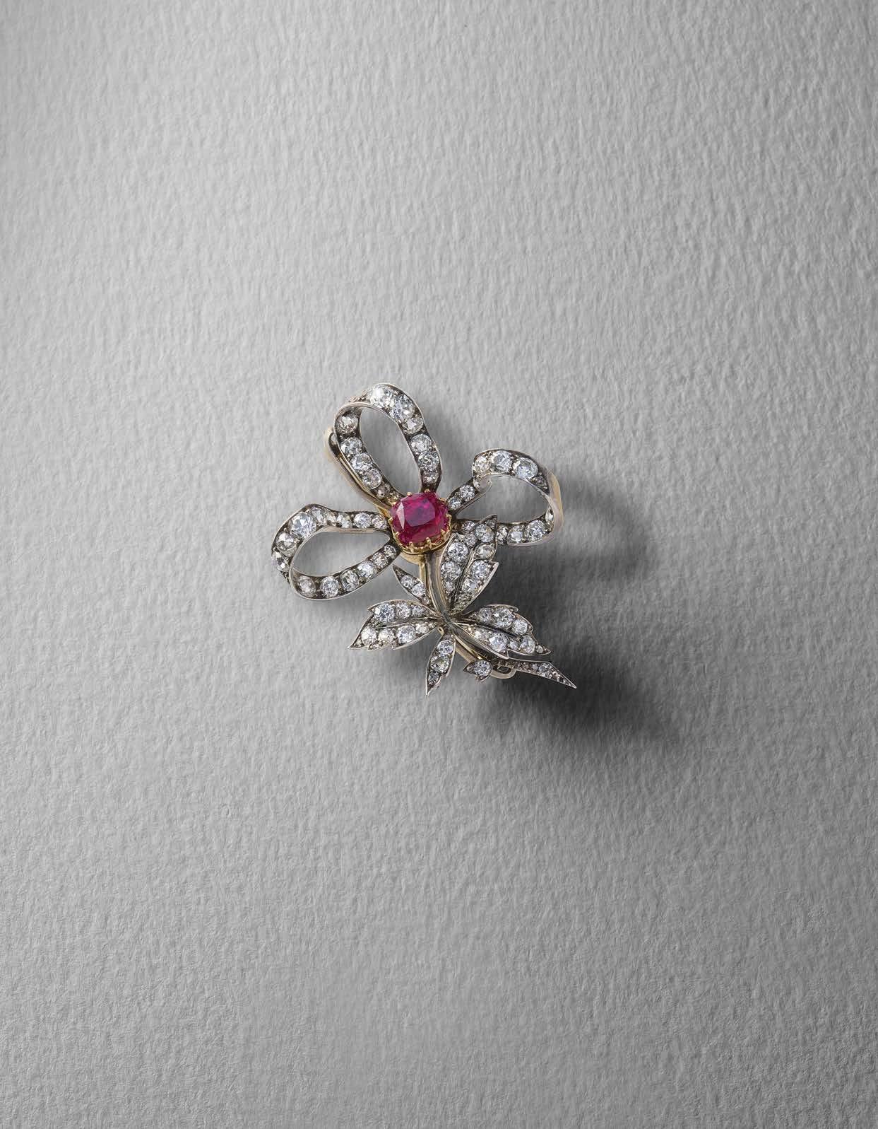 591 A VICTORIAN RUBY AND DIAMOND BOW BROOCH / PENDANT, C1890, centring on a cushionshaped ruby weighing 4.74cts with diamondset ribbon, in silver and gold, maker's mark FB, detachable pin, width 5.8cm