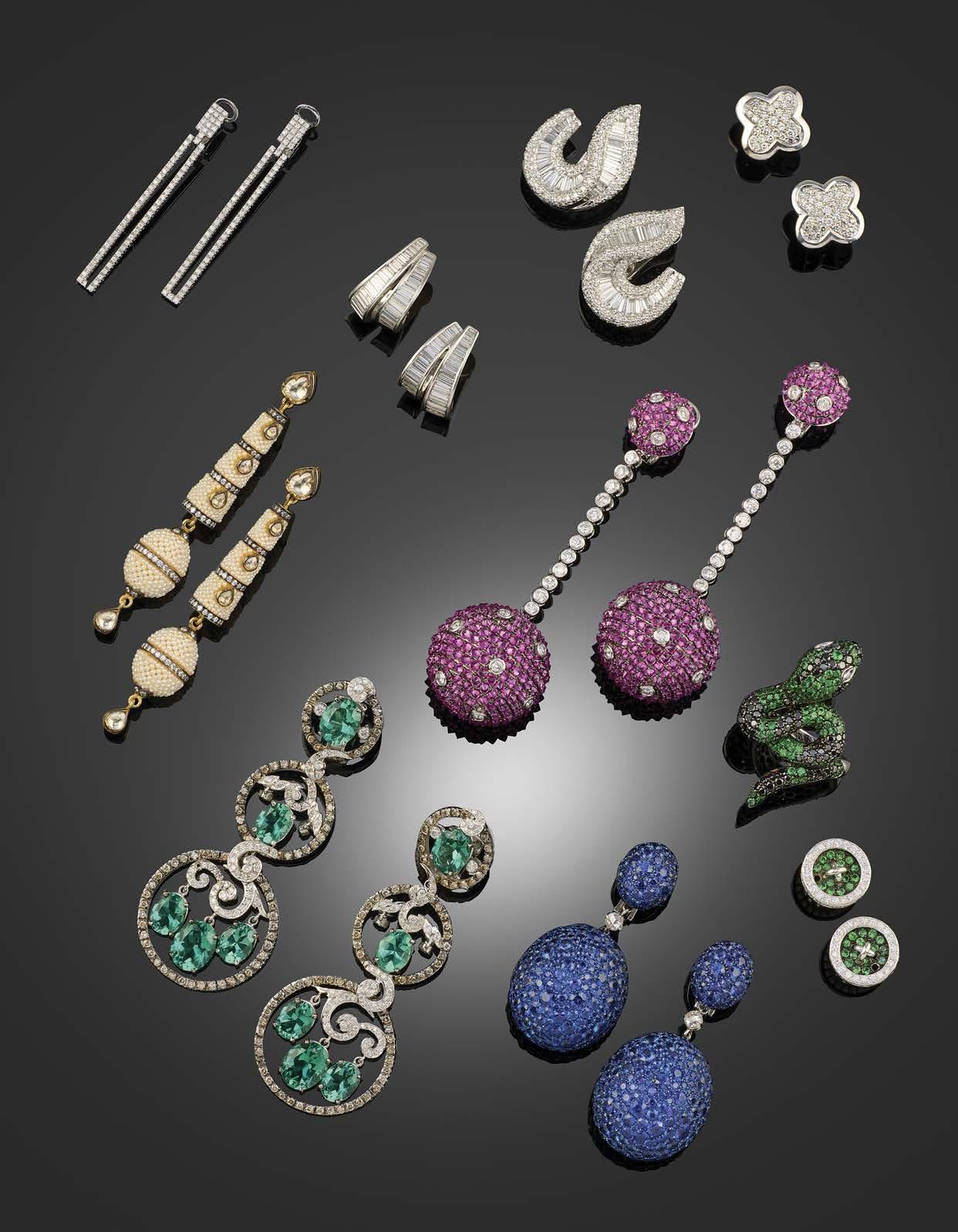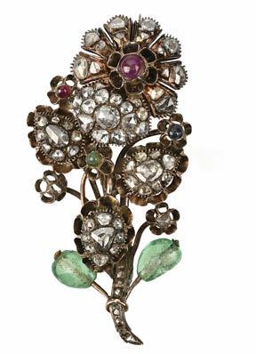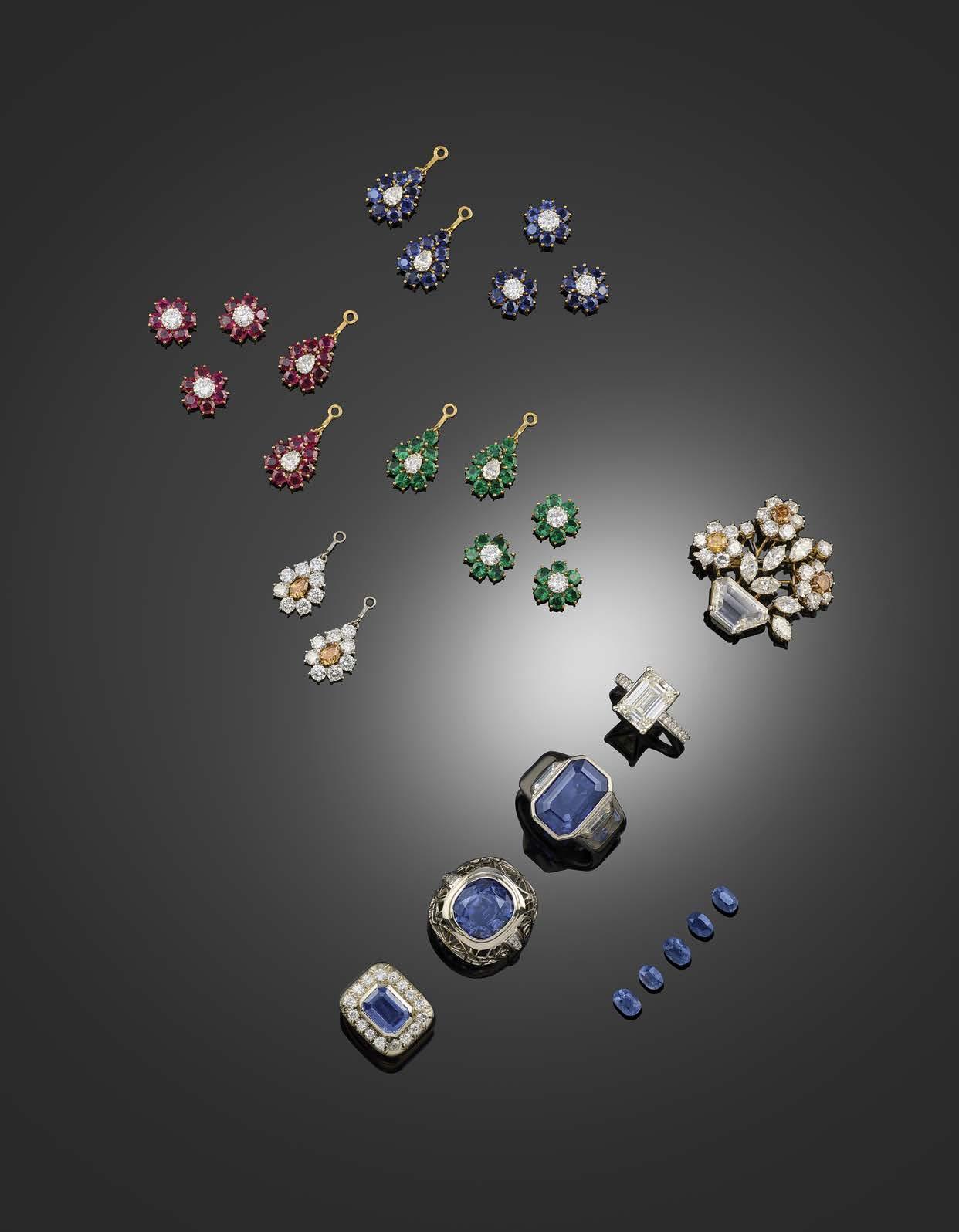 564 A DIAMONDSET GIARDINETTO BROOCH, CONVERTIBLE TO EARRINGS, comprising: a brooch mount designed as a stylised vase of flowers, set with a hexagonal diamond below five marquiseshaped diamonds, the three mounts supporting interchangeable clusters, composed of brown/orange and white diamonds, sapphires and diamonds, rubies and diamonds, and emeralds and diamonds, with further ear stud mounts, all in gold, ear studs indistinctly marked, brooch length 3cm, ear stud width 1.2cm, fitted case; together with removal pendants of ‘Day & Night’ design, each composed of a dropshaped cluster, set respectively with brown/orange and white diamonds, sapphires and diamonds, rubies and diamonds, and emeralds and diamonds, mounted in gold, stamped 750 and indistinctly marked, length 2.2cm, fitted case