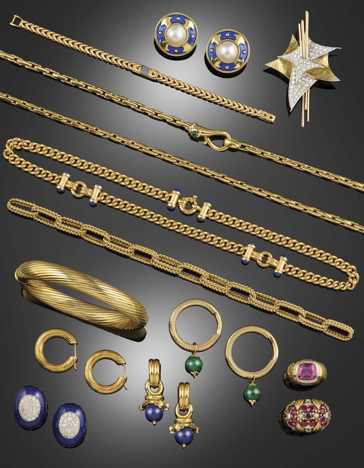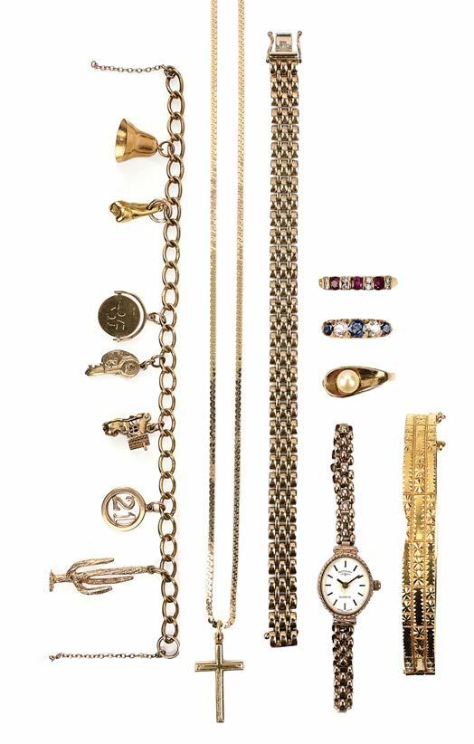 7 A COLLECTION OF JEWELLERY, including a gold charm bracelet, suspending eight charms including a bell, a boot, a circular ‘21’ motif, a cactus, a set of keys, a rotating fob and a tooth