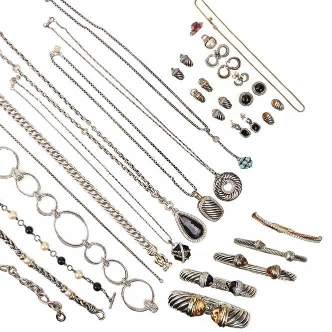A LARGE COLLECTION OF DAVID YURMAN JEWELLERY, including a diamondset silver necklace, of intertwining ropetwist and plain oval link design, interspersed with three diamondset links