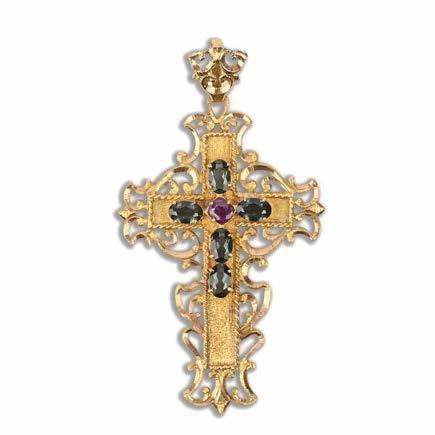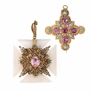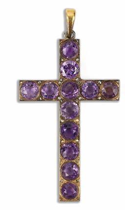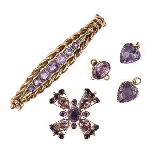 FIVE AMETHYSTSET GOLD ITEMS OF JEWELLERY, including a George III gold cruciform pendant