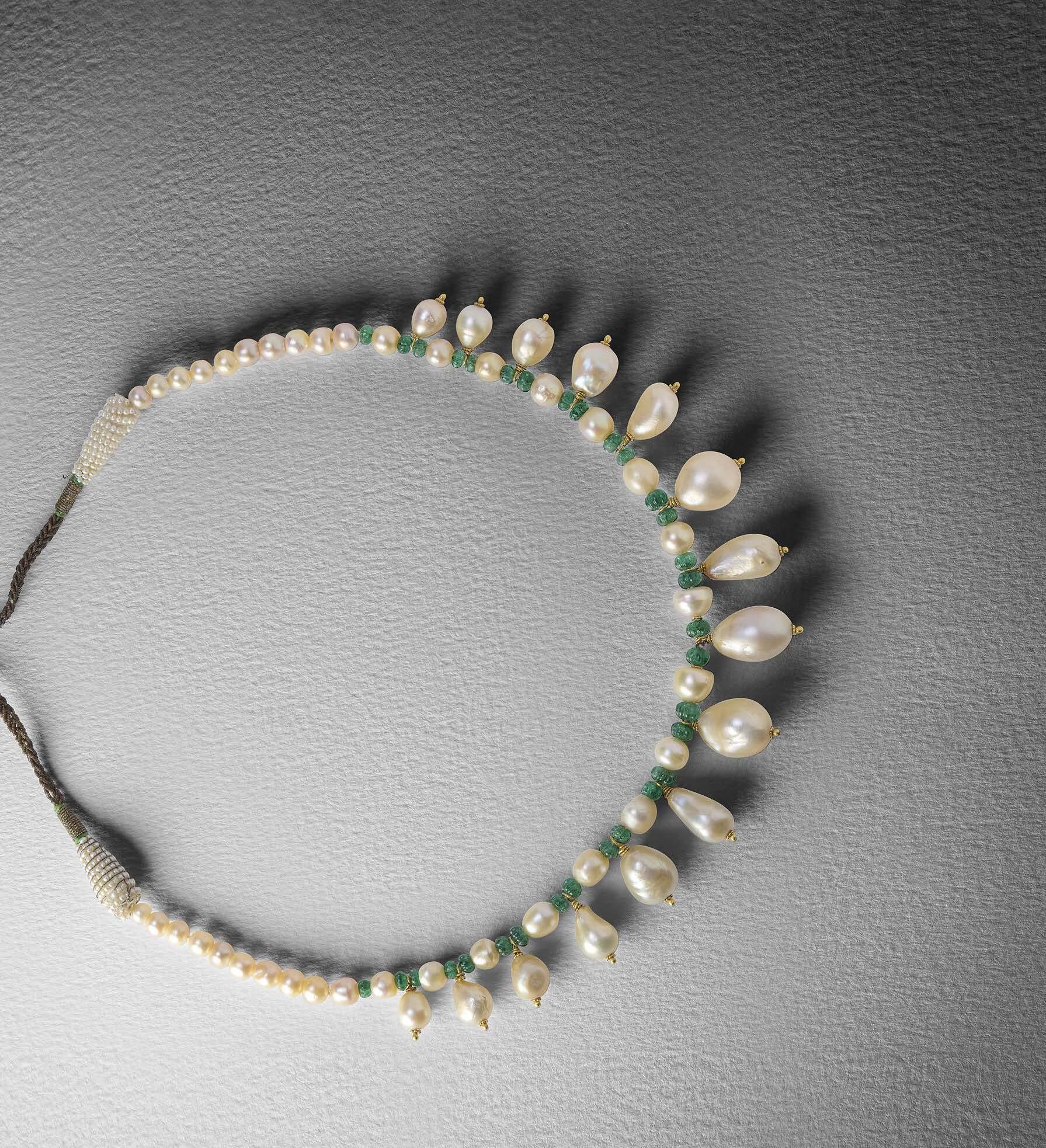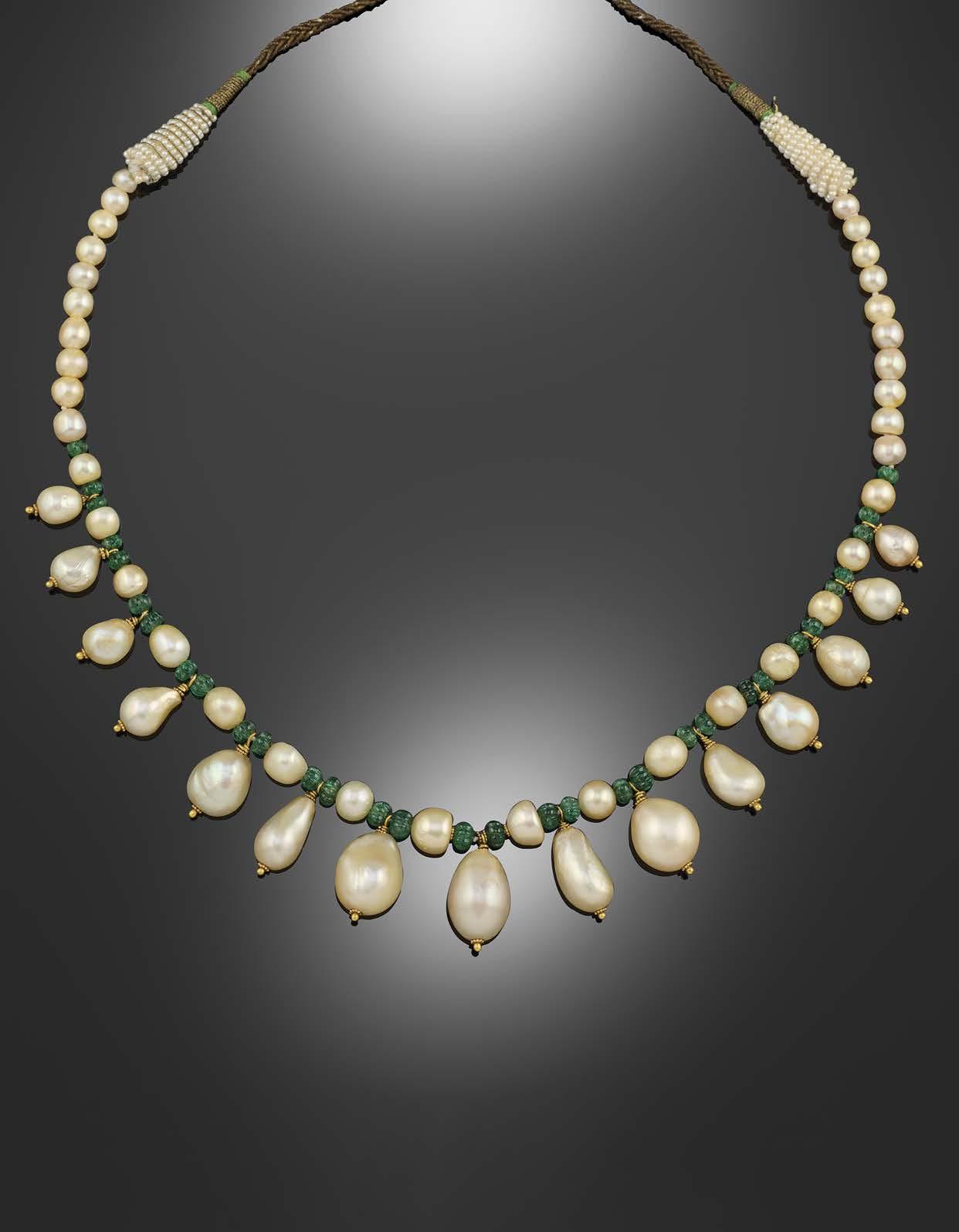 593 A NATURAL PEARL AND EMERALD NECKLACE, the graduated row of pearls alternatelyset with carved emerald beads and suspending 15 graduated pearl drops with gold finials, total weight of emeralds 22.726cts, on a woven fabric back chain, length 60cm