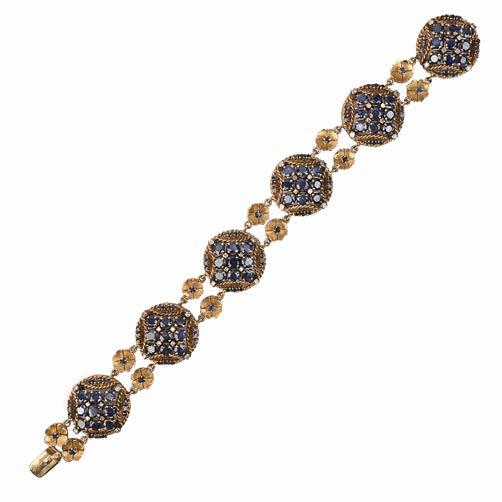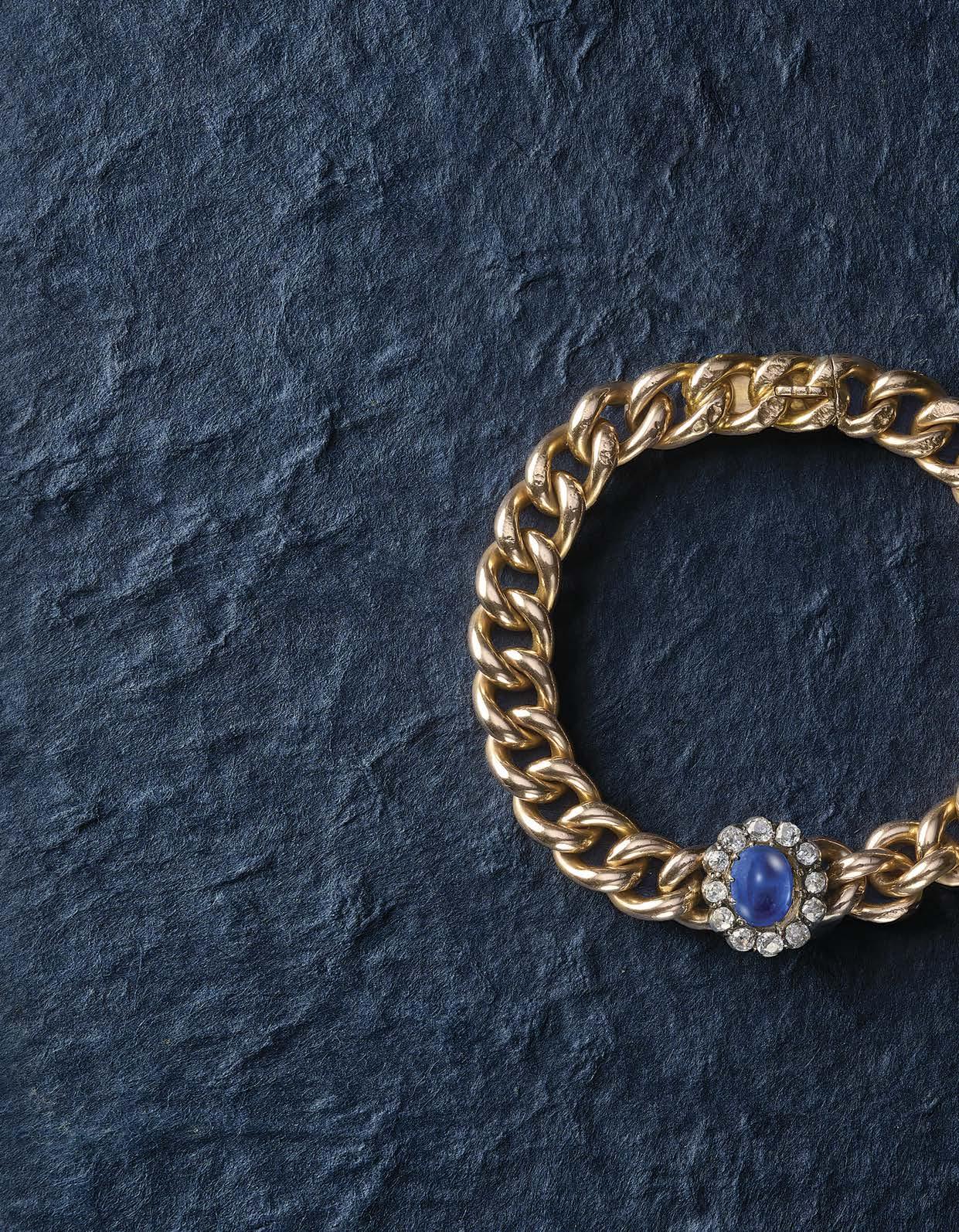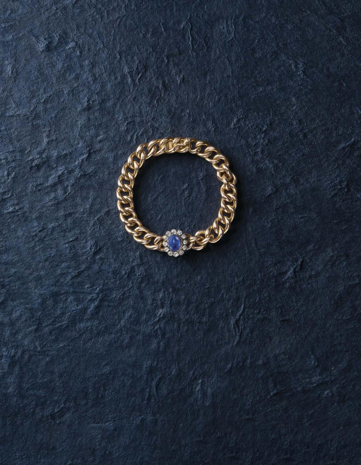 588 A VICTORIAN SAPPHIRE AND DIAMOND BRACELET, the oval cabochon sapphire weighing 3.414cts set within a surround of old cushionshaped diamonds on a gold curblink bracelet, length 18.5cm £30,00040,000