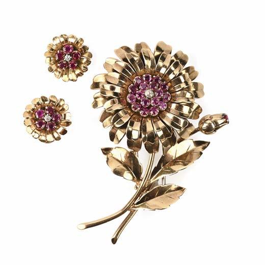 553 CARTIER, AN ENAMEL AND DIAMOND DEMI PARURE, C1960, comprising a stylised flower brooch decorated with blue enamel leaves with textured gold borders and diamond stamens in 18ct yellow gold, signed Cartier and numbered 019041, with French control marks and rubbed maker’s lozenge for Société Georges Richards, length 5.5cm, 30g, with a matching pair of earrings, signed Cartier and numbered 03998, with French control marks and makers lozenge for Société Georges Richards, clip fittings, length 2.5cm, 22g