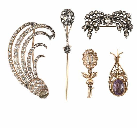 A COLLECTION OF FIVE BROOCHES, including a converted brooch, originally probably from an aigrette, designed as stylised plumage