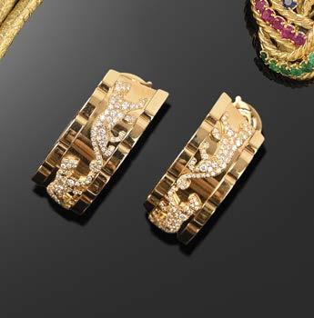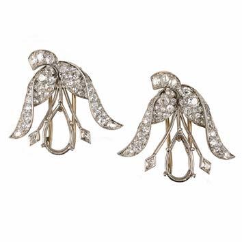 558 SUZANNE BELPERRON, A PAIR OF DIAMOND EARRINGS, C1935, each set with a cushionshaped diamond weighing approximately 2.50 and 2.90cts within bombé fluted surround decorated with graduated bands of old circularcut diamonds and terminating in diamond points in platinum and gold, clip fittings, posts probably later added, length 2.6cm £30,00040,000