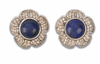 555 CARTIER, A PAIR OF AQUAMARINE, SAPPHIRE AND DIAMOND EAR CLIPS, each composed of two flowerheads set with ovalshaped and circularcut aquamarines and sapphires, each with a stylised leaf set with graduated old circularcut diamonds, mounted in platinum, signed Cartier London, clip fittings, length 3cm